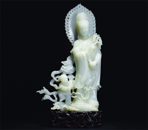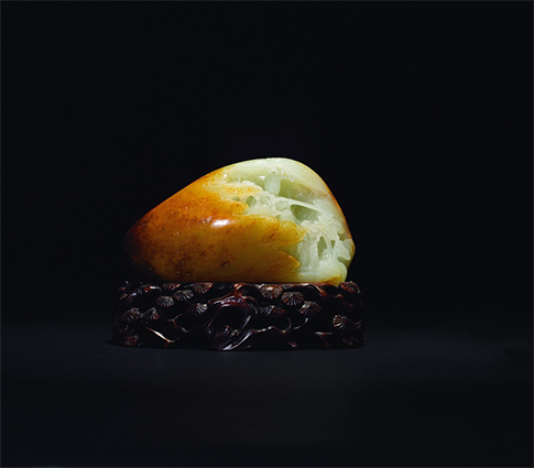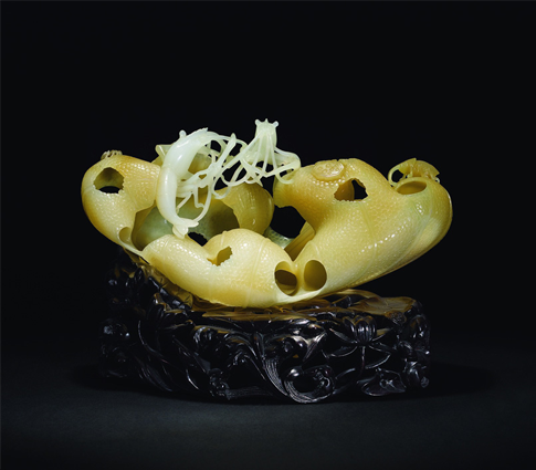 “花好月圓”的整體造型為一座雕滿靈芝的紫檀木托起一把宮扇,宮扇由檀香木、紫檀和翡翠雕刻而成。扇中心是一個轉動自如的鏤空花球,球體上刻有牡丹、梅花和蓮花,分別代表祖國、江蘇和澳門。扇柄中央雕刻牡丹和梅花,扇柄下端利用翡翠鏈條串聯(lián)起兩個檀香木雕花球和一塊磬形云板。構思精巧、線條流暢,蘊含花好月圓、興旺祥和的祝愿。